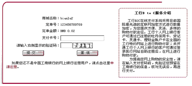 | 在我行特约网站选中商品放入购物车,确认订单,选择工行网上支付,进入支付卡号和验证码输入页面: | |
