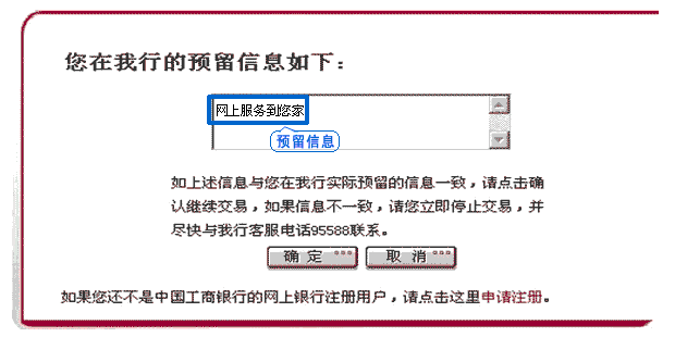 | 当您发现购物网站或网上银行显示的预留验证信息与您设置的不一致或者没有显示,请立刻停止交易,并立刻联系95588。 |