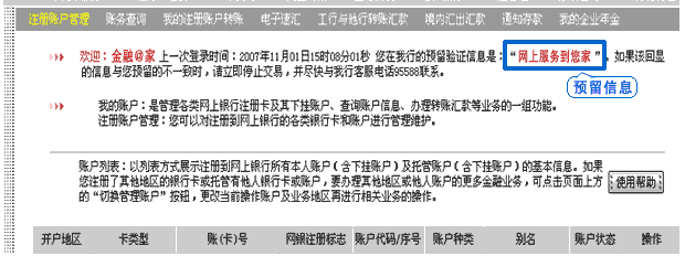 当您输入网银注册卡号(或登录别名)、登录密码、验证码后,将在登录的首页面展现您的“预留验证信息”: